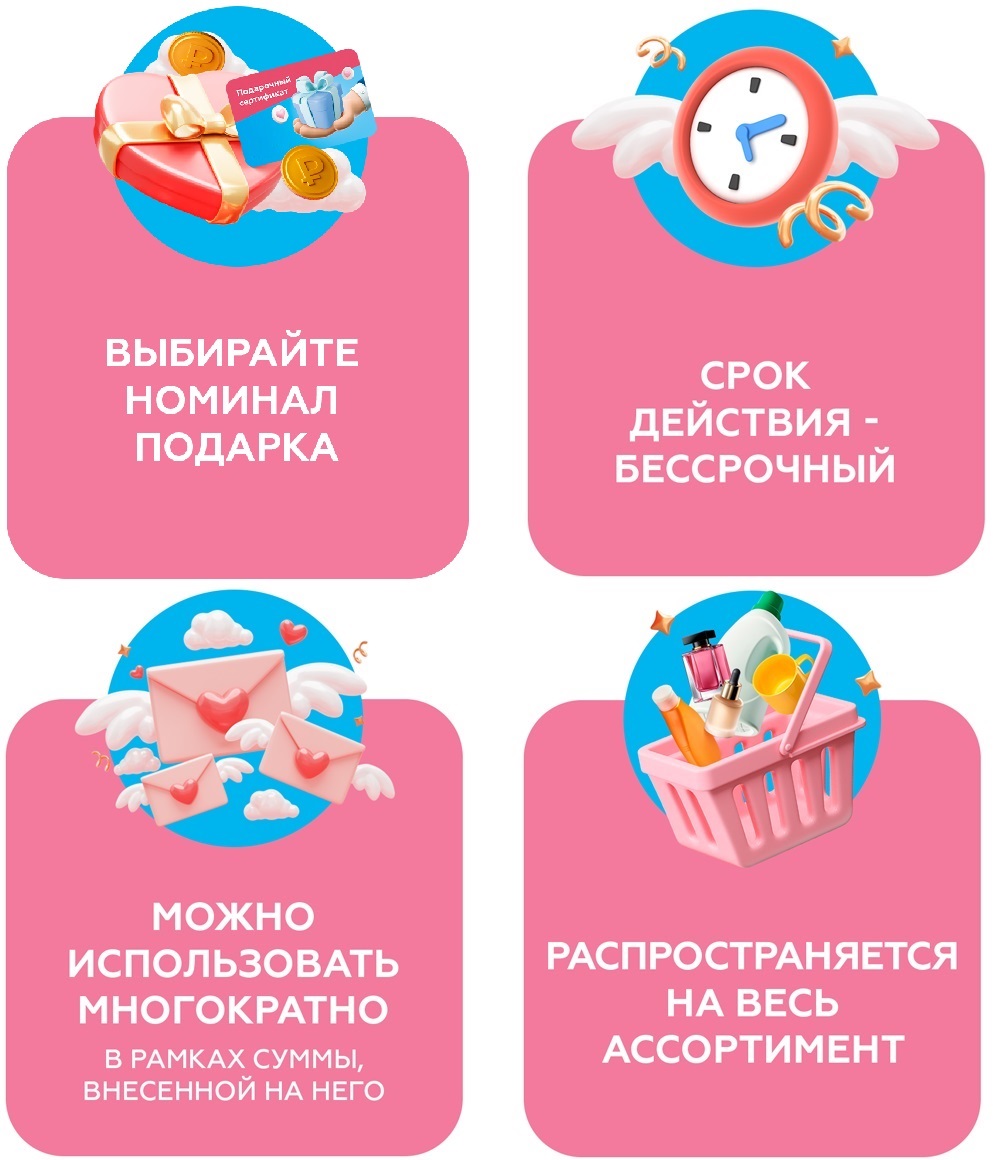 электронный подарочный сертификат распространяется на весь ассортиментный ряд продукции, реализуемой в магазинах КРЕМ;