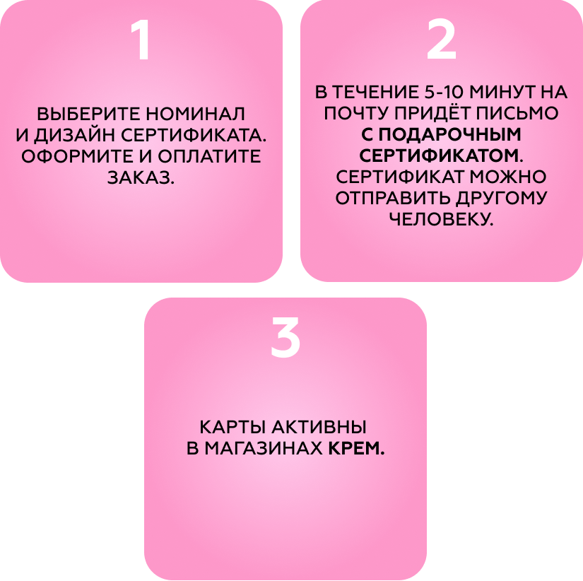 Электронный подарочный сертификат от КРЕМ — это отличный и полезный вариант подарка, который точно обрадует!